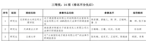 分别派出本科组队伍(安惠茵、梁宇婷、冯依文、阮钰涵),指导教师(冯 洁、高茜);研究生组队伍(王璐璐、王瑾、刘庆、伦超),指导教师(孙佳颖)参与涉外商事法律服务赛道。赛程设置个人知识赛和总决赛两个环节,采用线上方式举行,两支队伍均顺利入围决赛,并取得全国三等奖的优异成绩。