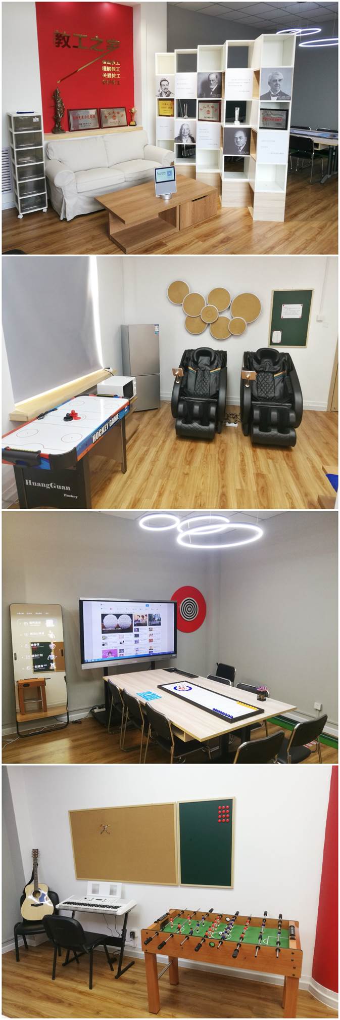 从去年10月份开始“教工之家”建设在学院党委统筹规划下克服疫情对施工带来的不利影响,经过基础装修、设备采购、进驻等环节精心打造了东西两侧不同功能的活动室,建成东区的休闲娱乐区和西区的运动健身区。东区包含生活服务、影音欣赏、休闲放松、益智娱乐四大主题,西区包含运动、健身两大主题,两个功能区共配置了28件(套)服务、活动设备。学院在教工之家规划中引入“智能之家”的概念,半数设备分别具有人机对话、面容识别、运动捕捉、智能物联、健康监测、在线课程等特色功能。经过本学期开学后校工会验收和试开放已于国庆节前正式投入使用,为全院教师提供互动交流、休闲娱乐、减压释负、运动健身一站式服务的健康之家!快乐之家!温馨之家!