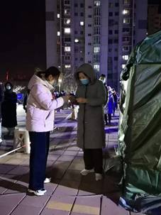 1月15日,沃耘院长积极响应号召,从日常服务学生的一线教学工作中转战服务人民群众的抗疫一线工作。为了配合核酸检测工作的顺利有序进行,她一早四点半便做好准备出发前往社区集合。根据工作人员的部署和安排,从早上五点半到下午一点半开展了津城第三次核酸检测的协助工作,由于所服务社区为老居民区,居民主要以老年人为主,行动不便,因此她负责耐心为他们解答疑问,提示他们各种疫情期间的注意事项。中午简单休息之后从下午三点到六点半,她再次投入到服务工作中去,协助居委会补测点进行补测工作,因老人使用手机不便,信息不畅,为确保筛查的全面性,她与工作人员一起顶着寒风,奔跑在社区的各个楼群里,一个楼栋接着一个楼栋,一个单元接着一个单元,挨家挨户准时准点无遗漏进行通知,带着电子喇叭走街串巷告知群众下楼参加检测。晚饭过后,一天的工作令她的膝盖滑膜炎旧疾发作,但她仍咬牙坚持通知到最后一个住户,直到晚上十点半才将所有事宜完成。