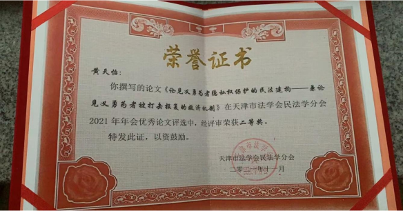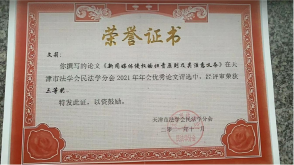 研究生积极参与征文活动,受益匪浅。2020级硕士研究生黄天怡同学的《论见义勇为者隐私权保护的民法建构——兼论见义勇为者被打击报复的救济机制》 参会论文获得本次年会优秀论文(学生组)二等奖;2020级硕士研究生文莉同学的《新闻媒体侵权的归责原则及其注意义务——以〈民法典〉第1025条为视角》 参会论文获得本次年会优秀论文(学生组)三等奖。